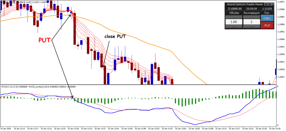 Опцион открывается в момент пересечения красными линиями ЕМА желтого мувинга в комбинации с пробоем гистограммой MACD нулевого уровня, а также в момент консолидации линий ЕМА выше/ниже желтого мувинга в комбинации с пересечением линий MACD между собой.
