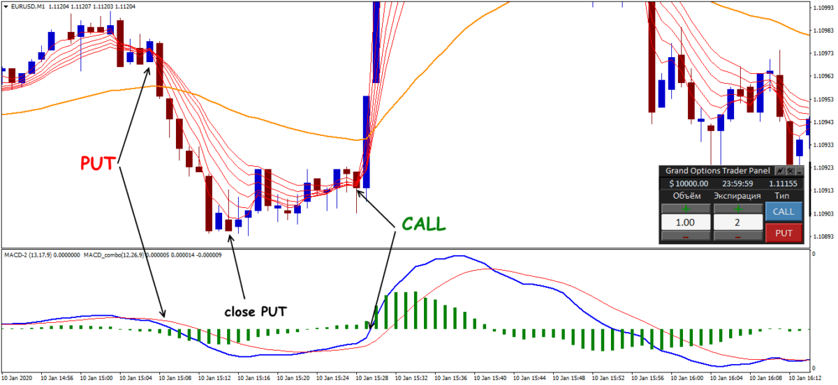 Хоть это не в наших правилах, но рискнем предложить вариант, который можно бесплатно скачать в сети вместе с соответствующим шаблоном для Метатрайдера. Методика интересна тем, что ее можно применять на таймфреймах выше М5 и опционах со сроком экспирации до 1 часа.