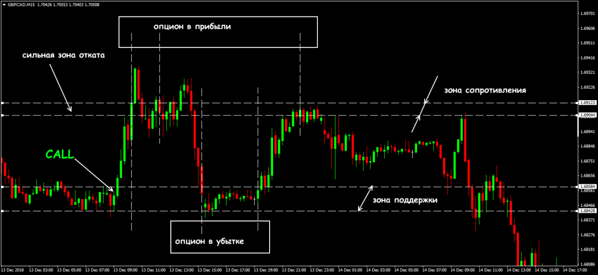БО на повышение, открытый в расчете на откат от зоны сопротивления, может оказаться как в прибыли, так и в убытке – все зависит от удачно выбранного срока экспирации. На схеме выше цена постоянно меняла положение относительно ключевой зоны, и если сделка Форекс может подождать и ее можно закрыть в любой момент, то малейшая ошибка в сроке закрытия опциона будет стоить вам премии. Рекомендаций по выбору оптимального времени БО методика не дает.