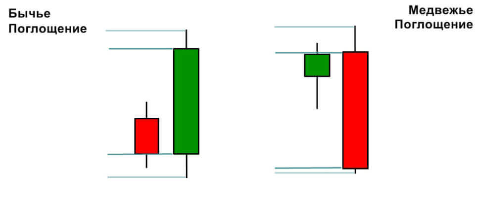 В общем случае, для реализации правильного механизма должно быть исполнено главное условие — следующая свечка перекрывает предшествующую и имеет противоположный вектор. Ниже графически представлены два типа — бычий и медвежий.